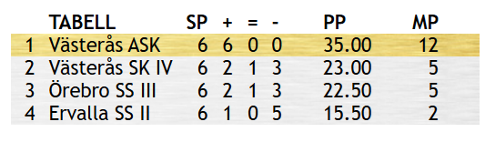 Sista matchen i säsongens allsvenska slutade med vinst med 6½-1½ mot Västerås SK IV. Därmed gick Västerås ASK genom allsvenskan med idel vinster och vann serien med klar marginal! Nästa säsong väntar åter spel i division II.